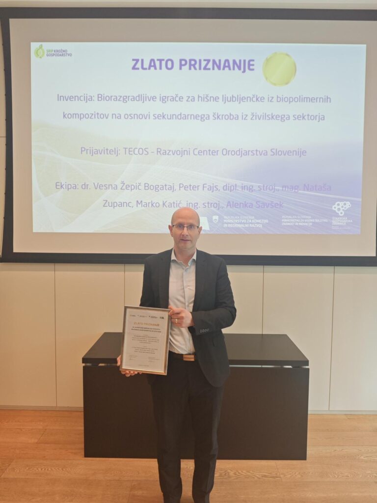 SRIP Krožno gospodarstvo in Štajerska gospodarska zbornica sta podelila priznanja za najboljše inventivne rešitve na področju krožnega gospodarstva 2025. Osrednji nacionalni dogodek, namenjen prepoznavanju, strokovni validaciji in promociji inovativnih rešitev, ki prispevajo k sistemskemu prehodu v krožno gospodarstvo je z zlatim priznanjem odlikoval tudi pasjo žvečljivo kost BioSTARCHew. Kot je ob podelitvi zlatega priznanja izpostavil direktor TECOS-a dr. Aleš Hančič, je prva biorazgradljiva pasja kost za žvečenje plod domačega znanja; jedro TECOS-ove razvojne ekipe so sestavljali dr. Vesna Žepič Bogataj, Peter Fajs in mag. Nataša Zupanc, ob TECOS-u pa sta partnerski konzorcij BioSTARCHew sestavljali še podjetji Mlin Katić ter Veterina in trgovina Tačka.